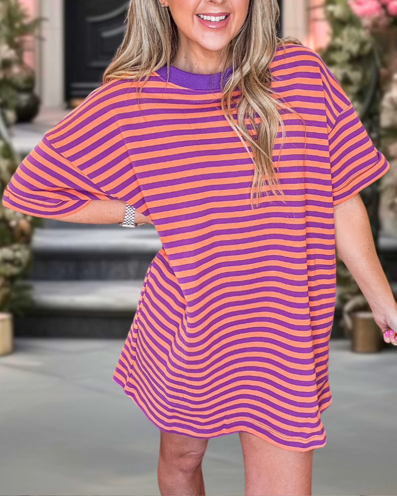 - Playful striped tee dress with oversized fit for all-day comfort. Trendy orange and purple knit design that's perfect for casual outings or lounging in style.